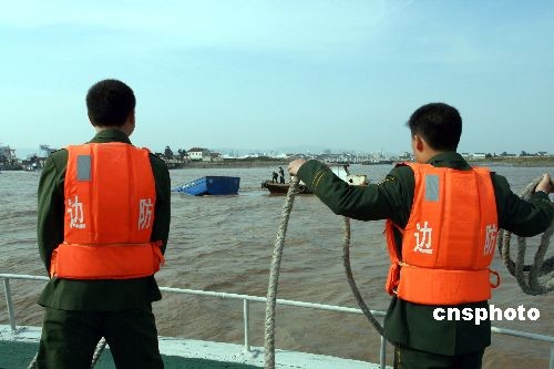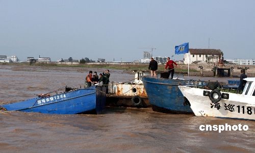 4月14日15时许,浙江瑞安一艘运沙船在飞云江航行时,突遇大风浪,船舱进水下沉。事发后,当地渔民、边防官兵、海事人员迅速投入营救,将遇险的运沙船船员成功救起,并组织拖拉船清理沉船。中新社发 蔡宽元 摄