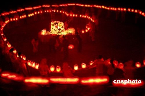 4月14日,安徽黄山市休宁新安江源头的右龙村的村民一齐上阵,按照传统习俗扛着一条120多米长的板凳龙从“右龙山庙”向村中热舞而来,燃放鞭炮,鼓乐迎接,上香求安,消灾避邪,共同祈福2009年风调雨顺、国泰民安。右龙村挥舞板凳龙为古徽州传统文化一绝,寓意保佑。板龙由右龙村一户一节板凳连接而成,每节1米多长,上装3盏红灯笼,花灯上贴有剪纸等,舞动起来十分威武壮观,气势恢宏。 中新社发 方也广德 摄