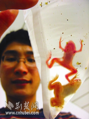 昨日(4月16日),武昌中北路(湖北武汉)周家大湾花鸟市场售卖的彩蛙引来顾客好奇。据摊主介绍,这指头大小的小东西叫“彩蛙”,有红、黄、绿三色,属于转基因品种,“绝对无毒”。彩蛙卖5元两只,寿命两年以上,平时只需喂些鱼饲料即可。不少顾客对彩蛙的安全性仍存疑问。(记者刘蔚丹 实习生黄康摄影报道)