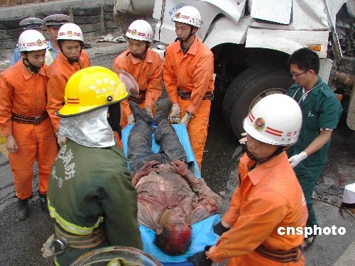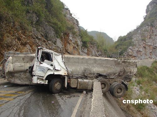 4月17日上午10时许,广西百色市田东县境内,一辆装载煤粉的大型槽车在转弯时侧翻横卧在公路上,事故造成车上两人一死一伤。中新社发 杨荣超 摄