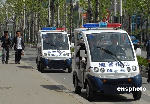 4月17日,山东潍坊市潍城区城管执法局四中队的电动巡管车在城区青年路上巡逻。日前,该局为城管执法人员配备了电动巡管车配合徒步执法中队的执法巡逻,巡管车上配备了打气筒、列车时刻表、公交线路图、城区地图等便民设施,为市民提供“零距离”服务。 中新社发 王晓光 摄