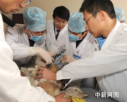 4月16日上午,河北河间市尊祖庄乡前申鲁村村民魏贵华救助了一只受伤的国家一级保护动物大鸨,随后志愿者将受伤大鸨接到河北沧州市野生动物救护中心。经初步检查,发现大鸨右腿骨折,在骨折处上方还有一个巨大肿瘤。为尽最大努力挽救受伤大鸨的生命,17日,动物救护中心请来了沧州市中西医结合医院李国良等3位骨科专家义务为大鸨诊疗。经过近3小时的手术,专家摘除了一个直径8cm,重达200g的巨大肿瘤,并切除了坏死的断肢。