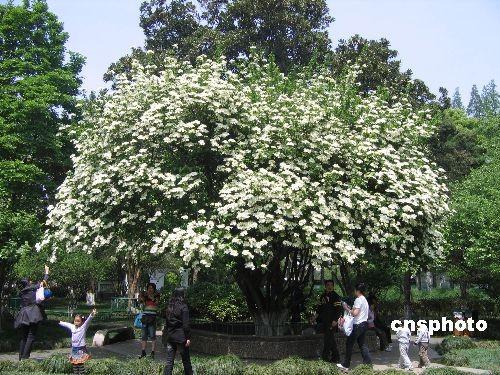 春暖花开,中国现存琼花树中最古老的一棵三百多岁琼花王近日进入花盛时期,一个个“玉盘”竞相压枝绽放,吸引中外游客前来争睹其芳容。琼花是中国独有的古老珍稀花卉,昆山亭林公园的这株“琼花王”,高六米、树冠大似幕、连理交枝,花开洁白如玉,艳姿天成。中新社发 黄莹 摄