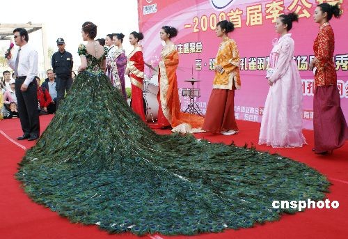 2009年4月26日,一款名为“玉羽云绝设”的孔雀羽婚纱亮相苏州李公堤。这款孔雀羽婚纱上缀有2009片孔雀羽毛,配以60粒和田玉饰,面料采用云锦,艳丽华贵。婚纱由苏州78岁的苏绣大师顾文霞参与设计和制作,价值高达999.9万元,让参观者大饱眼福。中新社发 李俊锋 摄