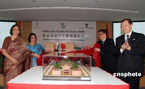 4月27日,上海世博会印度国家馆设计方案在上海揭晓,印度政府总代表希拉女士(前左)与上海世博会中国政府总代表华君铎(前右)等共同参加揭幕仪式。印度国家馆以“城市与和谐”为主题,强调城乡生活方式及文化的和谐。展馆位于世博园区A区,占地逾4000平方米,将展示印度丰富的文化传统、多样化的宗教信仰等。中新社发 潘索菲 摄