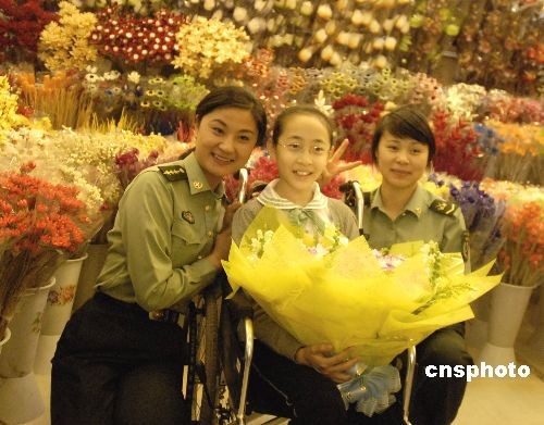 去年汶川大地震中,北川曲山小学一个喜欢跳芭蕾舞的十二岁女孩李月在地震中失去左腿,后来在解放军昆明总医院接受治疗。4月26日,这名被称为“芭蕾女孩”的李月来到昆明答谢对她悉心照顾的医生们。图为4月27日,她在解放军昆明总医院医生陪伴下到昆明岔街花市选购鲜花时,与同行的两名医生在花市留影。中新社发 保旭 摄