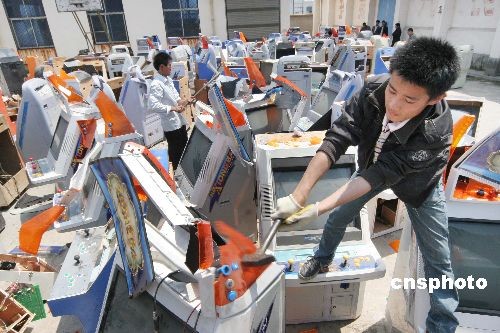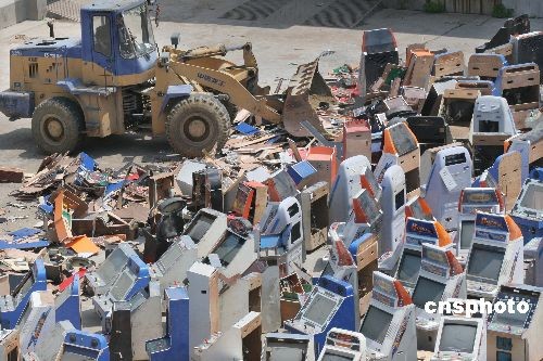 4月27日,江苏省赣榆县集中销毁赌博机活动现场,工作人员在销毁赌博机。当日,赣榆县警方举行集中销毁非法电子游戏机和赌博机活动,将近期在社会治安综合治理行动中查获的赌博游戏机423台及电路板336块全部销毁。中新社发 司伟 摄