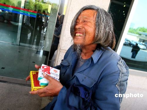 4月30日,曾在去年四川汶川地震后捐款三次的南京乞丐徐超近日被一名不愿意透露姓名的男子接到北京,为他安排住处、做体检并协助在北京找工作。2008年5月17日,南京江宁街头,乞丐徐超掏出5元人民币放进募捐箱;当天下午,徐超特意去银行将讨来的零钱换成整钱,又将100元塞进募捐箱;5月19日,徐超再次捐款339.01元。中新社发 富田 摄
