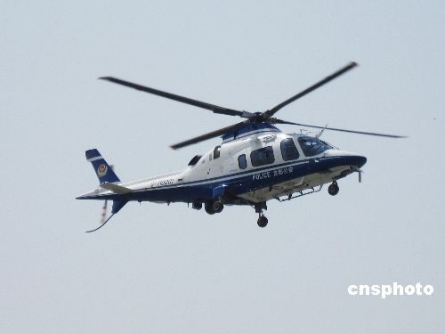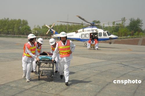 2009年4月30日,一架警用直升机降落在作为应急避难场所的海淀公园,早已等待的999急救人员迅速将直升机上的伤员转移抢救。这是由北京市公安、消防、999急救中心联合进行的高层紧急救援演习的预演现场,本次演习首次动用了警用直升机参加。中新社发 赵永亮 摄