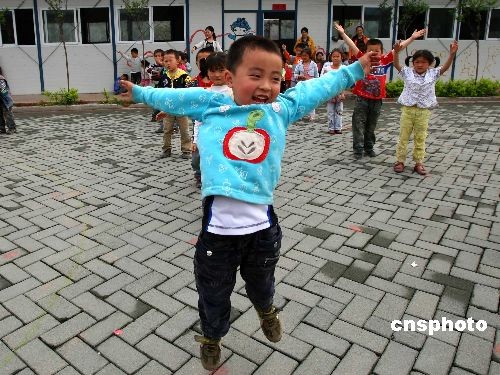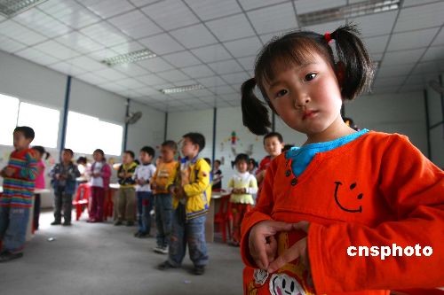 5月5日,什邡市洛水镇慈济幼儿园的小朋友正在排练手语歌,他们将在5月12日的纪念活动中以此种方式表达自己的心情。慈济是台湾知名的佛教慈善机构,去年汶川大地震以来,他们做了大量的救灾工作,并出资兴建了房屋、医疗、和教育设施,这所幼儿园就是慈济出资兴建的。中新社发 富田 摄