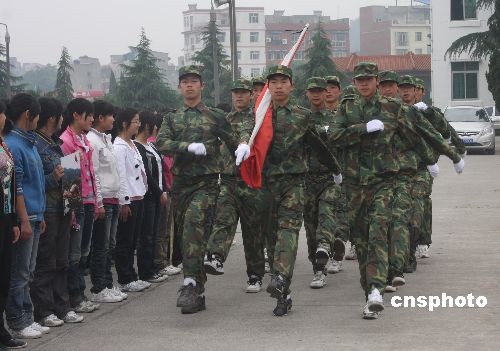 5月8日,四川省北川县北川中学新成立的“国旗班”学生在5.12地震一周年前夕举行升国旗仪式。5.12地震发生时,成都军区某红军师师长王凯和1500多名战友们第一时间赶到北川县,对北川中学的学生进行了抢救。官兵们和师生产生了深厚的感情,红军师和北川中学结为了军民共建单位,部队之前对北川中学新成立的“国旗班”学生进行了有关培训。当日,成都军区某红军师师长王凯和战友们给北川中学“国旗班”的12个学生送来了军装。并举行了新成立的“国旗班”学生首次升国旗仪式。中新社发 郭国权 摄