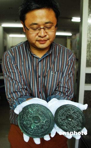 5月8日,江西九江市博物馆的工作人员正在展示出土的两面保存完好的并有铭文刻字的东晋铜镜。江西九江市日前在市区十里河整治工程施工中发现弧形古墓,经当地文物部门发掘,先后出土了青瓷双系罐、青瓷钵、铁剑、铜镜、铜钱、银器等30余件文物。根据古墓的形质、饰纹和出土的文物,基本确定该古墓的年代为六朝时代,与东晋同期。中新社发 胡国林 摄
