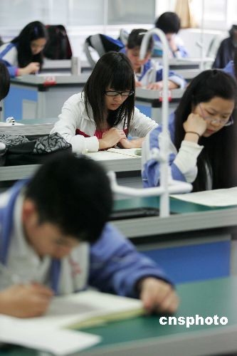 5月8日,都江堰中学高三学生进行了高考前的第三次模拟考试,备战高考。这是都江堰在5.12震后开学的第一所永久性学校。中新社发 富田 摄