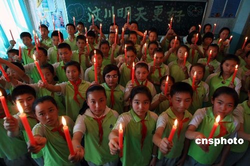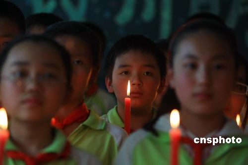 5月11日,汶川地震周年之际,新疆乌鲁木齐一小学校学生举行“汶川我们在一起”主题活动,同学手持点燃的蜡烛演唱地震歌曲《生死不离》为灾区祈福。中新社发 刘新 摄