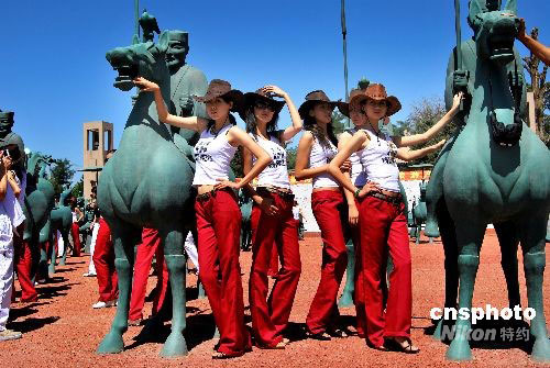 8月30日,第十届敦煌国际服饰模特艺术节暨武威旅游产品发布会在我国旅游标志“马踏飞燕”的出土地甘肃武威雷台公园举行。在发布会上,来自全国十多个省、市的40多名模特在雷台景区进行了形象展示和旅游景点的推介,全国40家加媒体记者行了采访拍摄。中新社发 孙煜东 摄