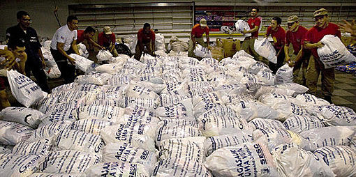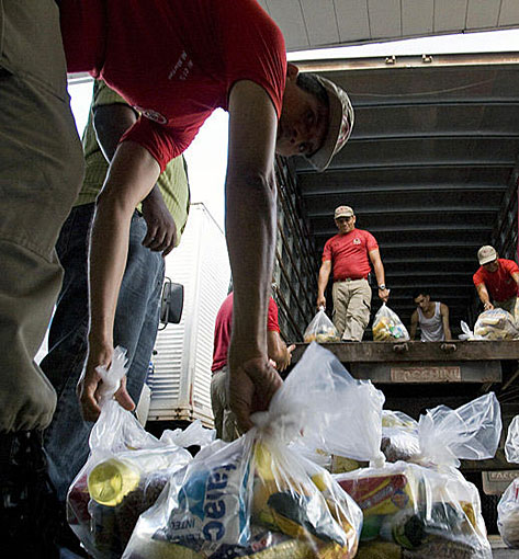 5月13日,工作人员在巴西北部马拉尼昂州搬运救灾食品。巴西北部洪灾已造成至少44人死亡,超过30万人无家可归。
