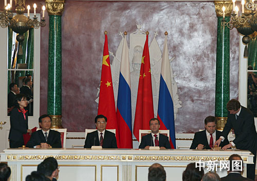 在中俄两国元首的见证下,中国发展与改革委员会副主任、国家能源局局长张国宝(左一),十七日与俄罗斯能源部长什马特科(右一)签署两国关于天然气领域合作备忘录。中新社发 齐彬摄
