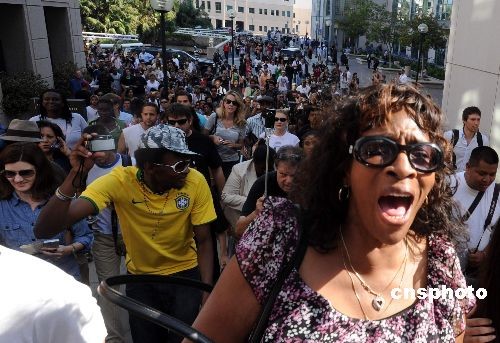 自封为“流行天王”的美国著名歌星迈克尔·杰克逊当地时间六月二十五日中午在洛杉矶病逝,终年五十岁。消息传出后,近千名歌迷和媒体记者赶往救治杰克逊的加州大学洛杉矶分校医疗中心。中新社发 张炜 摄