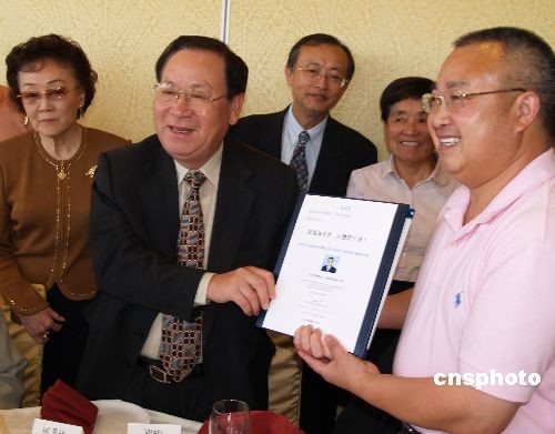 6月28日,清华大学校长顾秉林访问美国洛杉矶,美国易沃公司董事长、哈伯特实验室主任王鼎华特向顾秉林校长赠送纪念册。中新社发 卢威 摄