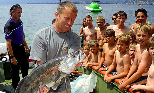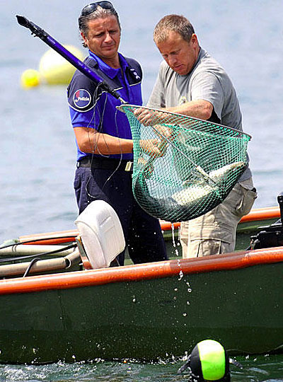 7月12日,在瑞士南部的马焦雷湖,一名男子展示警方捕获的鲈鱼。这条长70厘米、重8公斤的鲈鱼在上周末咬伤了6名戏水者,其中两人在医院接受了紧急救护,其伤口长达10厘米。