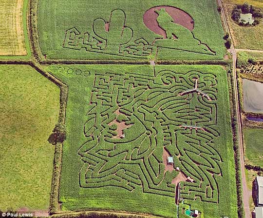 今年的迷宫建在特伦特河畔的伯顿附近。迷宫的路径展现了美洲酋长头戴羽饰深情注视英国斯坦福郡乡野的样子,相邻的田地里则用一株巨大的仙人掌和一头对月长啸的郊狼来延续西部风情。整个迷宫占地14英亩,仅印第安人的头部就宽达500英尺,交错的迷宫路径则长达3英里。