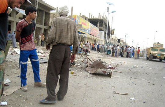 7月21日,伊拉克官员和医疗人员称,伊拉克首都巴格达和西部城市拉马迪发生多起炸弹爆炸事件,造成至少5人死亡,40人受伤。图为伊拉克首都巴格达的萨德尔城,人们在聚集在发生爆炸的现场。
