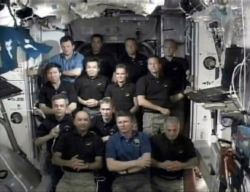 7月26日,奋进号宇航员在空间站出席新闻发布会,图为美国航天局的电视截图。