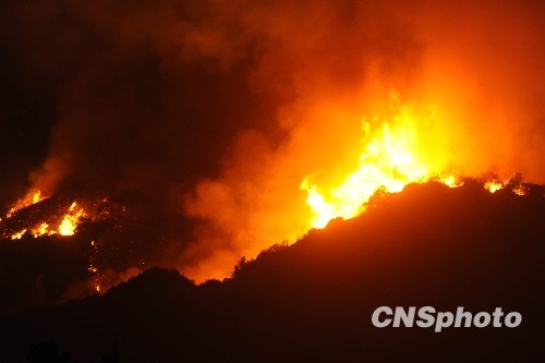 当地时间八月二十七日,洛杉矶市周边地区爆发至少四处山火,大火逼近人口稠密的居民区,部分建筑被毁。当晚,消防部门要求数百户居民紧急撤离住所。至少一千七百名消防员在火场扑火,截至二十七日深夜,火势尚未得到控制。中新社发 张炜 摄