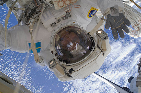图为瑞典宇航员克里斯特·富格莱桑9月5日在国际空间站外进行太空行走。“发现”号航天飞机的两名宇航员当天进行了第三次也是最后一次出舱太空行走,完成一系列国际空间站设备安装和维护工作。
