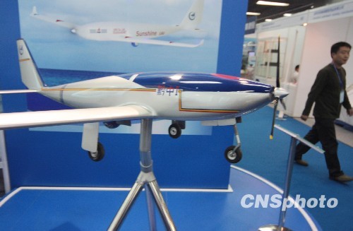 10月12日,贵航集团研制生产的“黔中-I”型无人侦察机亮相北京国际减灾应急技术设备展。该机翼长14.5米、机身高8.5米,最大起飞重量为660千克。这个无人飞行器系统实现了无人机自主滑跑式起飞或着陆,可携带合成孔径雷达、电视摄像机、高光谱远程传感设备等,获得的各种观察图像能够实时传回地面。中新社发 吴芒子 摄