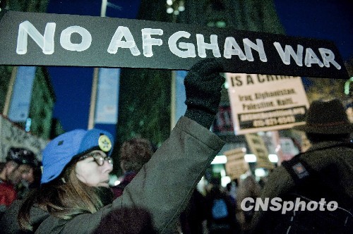 奥巴马12月1日晚间在西点军校宣布了增兵3万的阿富汗军事计划,美国华盛顿、费城、旧金山等数个城市2日同时举行抗议示威活动。图为旧金山民众在市中心集会,反对奥巴马增兵阿富汗,要求立即结束侵略战争,让士兵回家。中新社发 陈钢 摄
