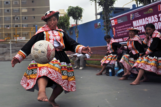 12月12日,秘鲁印第安妇女在利马国家体育场外举办了一场特别的足球赛,所有的球员均身着传统服饰光脚上阵妙趣横生。
