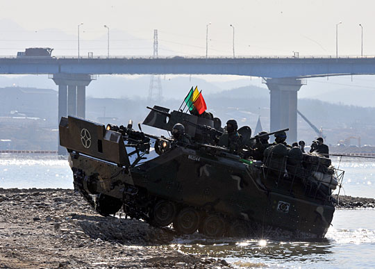 12月16日,韩国第20师团机械化部队在京畿道骊州南汉江一带进行大规模渡河实战训练。该训练以培养战斗执行能力为重点。