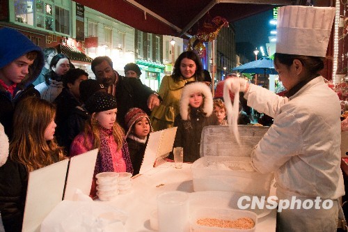 12月30日,在英国伦敦唐人街一家餐厅门外,厨师现场制作龙须糖,吸引许多顾客购买作为新年礼物。龙须糖原为中国新疆特产,据传已流传民间两千年。中新社发 赵依依 摄