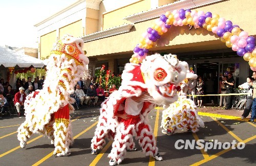 2010年1月12日,新年伊始,美国经济仍旧低迷,但洛杉矶华人社区经济圈巳很活跃,一家生鲜综合市场在舞龙舞狮和鞭炮声中开张,为美国“寒冬经济”带来一丝春意。中新社发 卢威 摄