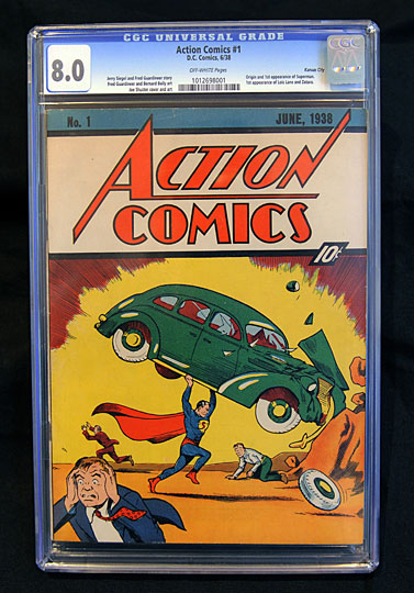 穿蓝色紧身衣、披红色斗篷的“超人”随1938年第一期《动作漫画》上市而“诞生”。《动作漫画》创刊号面世时售价10美分,现阶段大约100本留存于世。