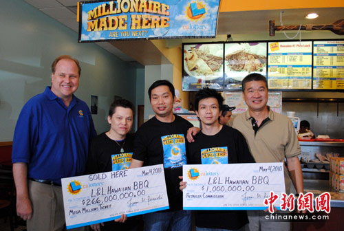 美国加州彩票局官员5月5日向夏威夷烧烤店的三位华人店主杨迈克、何丹尼、欧家豪(左2、3、4)颁发彩票巨奖销售奖金100万美元。加州彩票局确认,昨晚开出的美国“兆彩”(Mega Millions)2.66亿美元头奖彩票在这家华人餐厅售出。 中新社发 张炜 摄