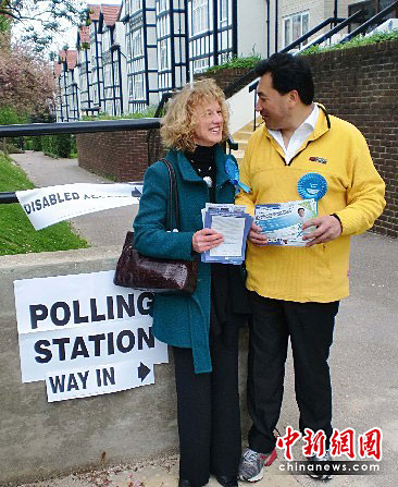 当地时间5月6日,英国大选全国投票日,代表保守党竞选国会议员的华裔候选人李泽文和夫人莎莉前往选区投票站拉票。今届大选共有8位华裔候选人竞逐国会议员,此前英国国会尚无华裔议员。中新社发 魏群 摄