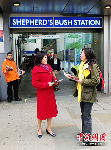 当地时间5月6日英国大选日,代表自民党竞选国会议员的华裔候选人杜淑真,在伦敦选区地铁站派发竞选传单。今届英国大选共有创纪录的8位华裔候选人竞逐国会议员,此前英国尚无华裔国会议员。中新社发 魏群 摄