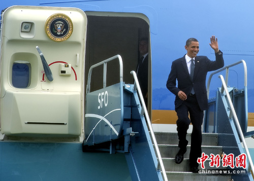 当地时间5月25日下午5时12分左右,美国总统奥巴马乘空军一号抵达旧金山国际机场。选自旧金山的国会参议员鲍克塞寻求第4次连任面临来自共和党的前惠普女总裁菲奥莉娜挑战,奥巴马当晚在旧金山出席两场为鲍克塞举行的筹款活动,随后他还将在一家太阳能公司和工人们谈经济和就业。中新社发 陈钢 摄