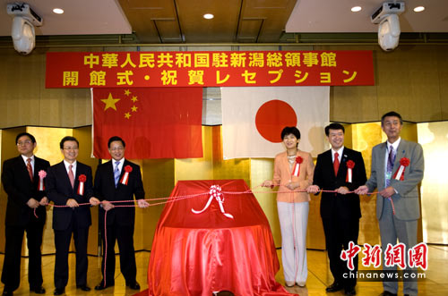 6月24日,中国驻日本新泻总领事馆正式开馆。新泻总领事馆是中国继在大阪、札幌、福冈、长崎、名古屋设领之后的第6个驻日总领馆。图为开馆仪式上中日嘉宾为新泻总领事馆揭牌。中新社发 孙冉 摄