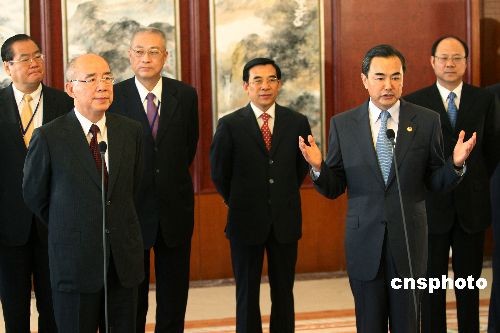 应中共中央总书记胡锦涛之邀,中国国民党主席吴伯雄率领的中国国民党大陆访问团5月25日上午11时许抵达北京首都国际机场,中共中央台湾工作办公室主任王毅到机场迎接并致欢迎词。中新社发 任晨鸣 摄