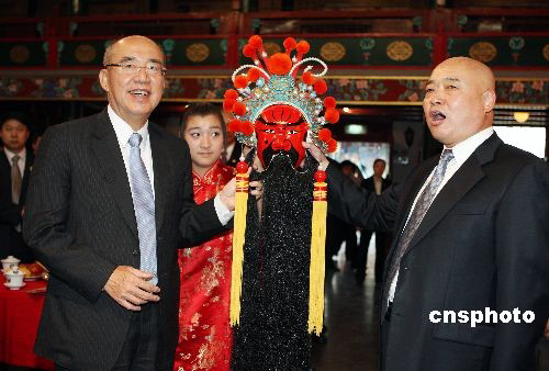 5月25日下午,中国国民党主席吴伯雄一行到北京湖广会馆参观,湖广会馆馆长霍建庆(右)向吴伯雄赠送礼物“关公脸谱”。