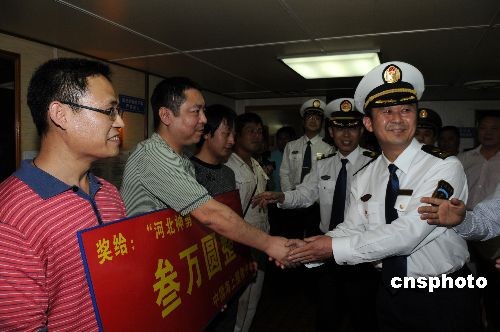 5月26日,河北远洋公司所属“河北神勇”轮载着被救起的5名菲律宾渔民靠泊山东日照岚山港,日照海事局副局长阚永仁代表中国海上搜救中心为该轮颁发了三万元即时奖励。 据“河北神勇”轮船长封力介绍,5月20日,该轮在从乌克兰开往日照途中,于我国南海海域中沙群岛附近发现一木筏,在中国海上搜救中心的指挥协调下,成功救起5名菲律宾渔民。8名菲律宾渔民出海打渔时,遭遇大风浪。其中3人死亡。该5名渔民在海上漂流15天后,被“河北神勇”轮船员救起。 到记者发稿时,菲律宾驻华大使一等秘书门多萨一行已经同这5名渔民前往北京,再由北京乘飞机返回菲律宾。中新社发 陈为峰 摄