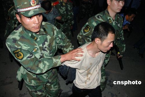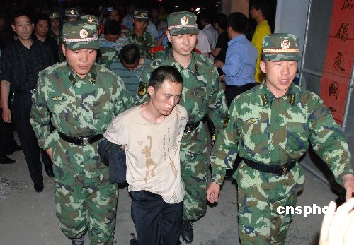5月28日晚,安徽省界首市看守所将脱逃的3名在押人员,在河南鹿邑县被警方抓获后,被押解回界首。5月23日凌晨,界首市看守所同一号房的4名在押人员佯装打架,趁监管人员打开监室门时乘机脱逃。其中一名犯罪嫌疑人在翻越大门时被门上护钉扎伤主动脉,经抢救无效死亡;其余3人脱逃。案件发生后,界首市公安局集中400多名警力,全力布控、排查和抓捕,同时组织12 个工作组分赴河南沈邱县、郸城县、鹿邑县,江西赣州等地开展追捕。28日,经侦查获悉,3名脱逃人员在河南鹿邑县一建材市场出现,专案指挥部迅速指令鹿邑工作组赶赴现场,将3人一举抓获。中新社发 戴民 摄