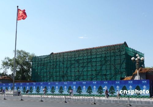 5月30日,位于北京长安街上的中南海新华门前搭起了绿色围挡,修缮工作已全面展开,将以崭新的面貌迎接新中国成立60周年的到来。中新社发 玉龙 摄