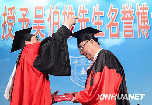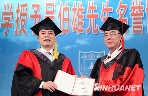 5月31日,南京大学授予吴伯雄法学名誉博士学位,南京大学校长、校学位评定委员会主任陈骏向吴伯雄颁授学位证书。邢广利 摄