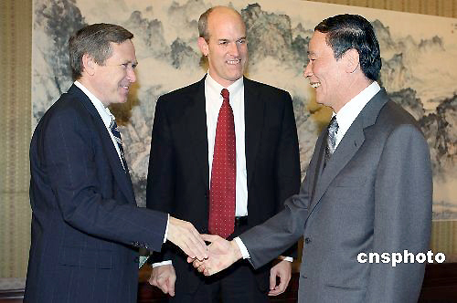 5月31日下午,中国国务院副总理王岐山在北京中南海紫光阁会见应邀访华的美国国会众议院“美中工作小组”共同主席里克·拉森(中)、马克·柯克(左)一行。中新社发 任晨鸣 摄