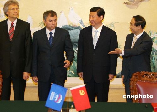 6月2日下午,中联部部长王家瑞(右一)在北京人民大会堂与俄罗斯“统俄党”总委会主席团书记、俄罗斯国家杜马副主席维·沃洛金(左二)签署《中国共产党与统一俄罗斯党合作协议》、《中国共产党与统一俄罗斯党2009-2011年合作备忘录》两项协议。中共中央政治局常委、国家副主席习近平(右二)出席签字仪式。中新社发 任晨鸣 摄