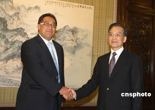 6月16日下午,中国国务院总理温家宝在北京中南海紫光阁会见太平洋岛国议会代表团。该代表团应中国全国人大常委会委员长吴邦国的邀请访华,成员包括密克罗尼西亚联邦国会、汤加王国议会、斐济群岛共和国公共账目委员会、纽埃议会和瓦努阿图共和国议会。图为温家宝与汤加王国议会议长图伊拉克帕握手。中新社发 任晨鸣 摄